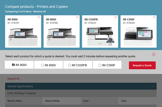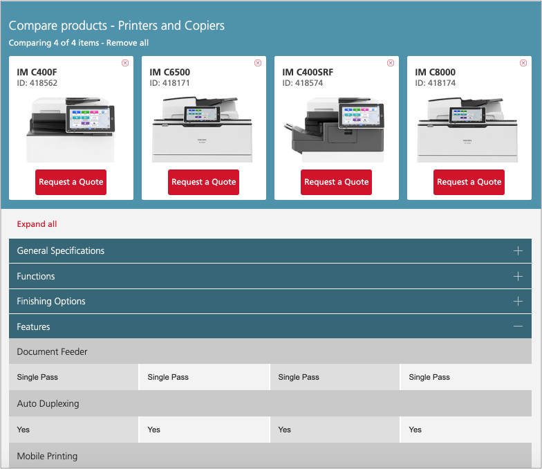 Specifications are grouped by category. The General Specifications category accordion is open by default, as can be seen in the image above. Users may collapse categories and open others for comparison. Users also have the option of expanding all of the category accordions with the Expand all link. The Expand all link becomes a Collapse all link.