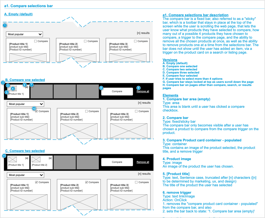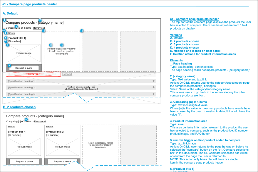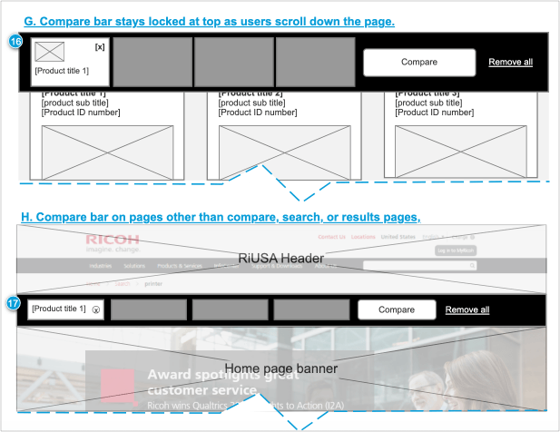 The compare bar first appears on the product search results page, then collapses but remains visible as users navigate the site. Fixed to the top of the screen, it stays in view while scrolling. This design, based on analytics showing increased quote requests when items remain visible, ensures users don’t forget about their compared products.