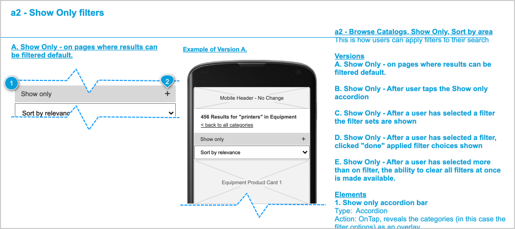 The graphic below shows the mobile experience changes, highlighting the original design’s horizontal scrolling to view and delete selected filter sets at marker 3.
