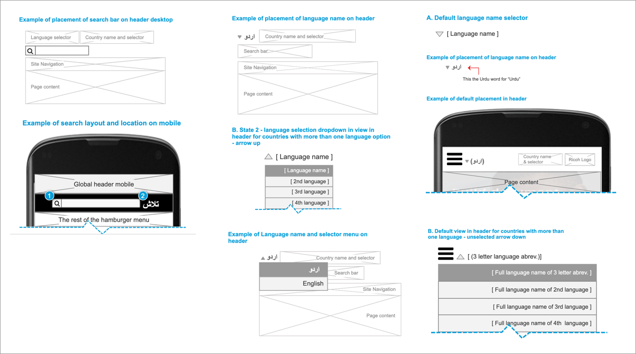 The header elements align to meet the needs of each global website and each language used. They look and feel similar but the design allows for each country's exceptions and nuances. Some sites may have a primary service site that needs to be placed in the header, while others have no need for a language selector. Each exception does not stray far from from the layout for a usable header for each country.