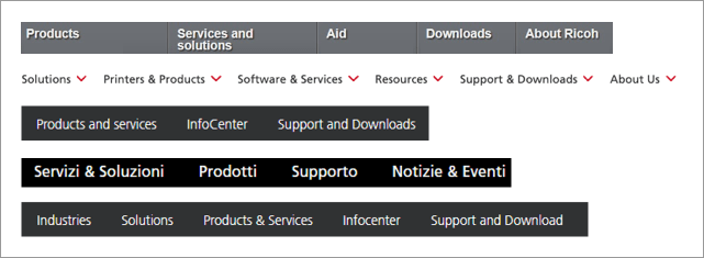Ricoh operates 61 country-specific websites. As the company grew without unified standards, countries independently designed their sites, resulting in 15 different header designs.
